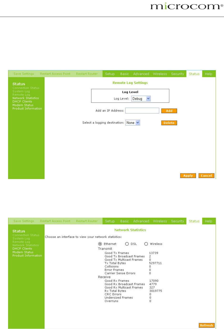 Information regarding the Status and Statistics of your Ethernet, USB and DSL line will be displayed.